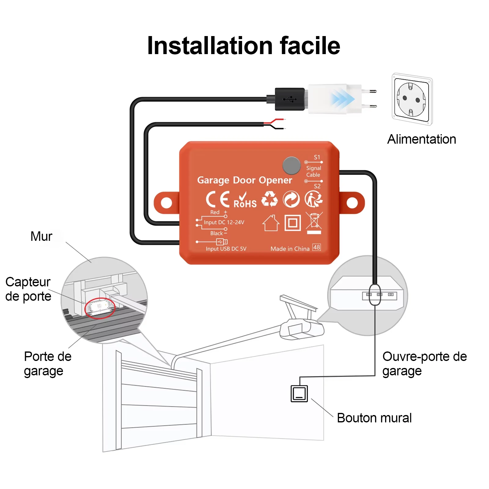 - Par rapport au module précédent, les fils qui doivent être installés ont été soudés et il vous suffit de connecter l'appareil au dispositif de porte de garage et de le brancher sur l'alimentation pour l'utiliser.