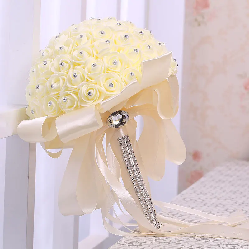 Un bouquet de mariage de roses blanches artificielles, une mariée tenant un bouquet de demoiselle d'honneur de fleurs artificielles et un bouquet de mariage