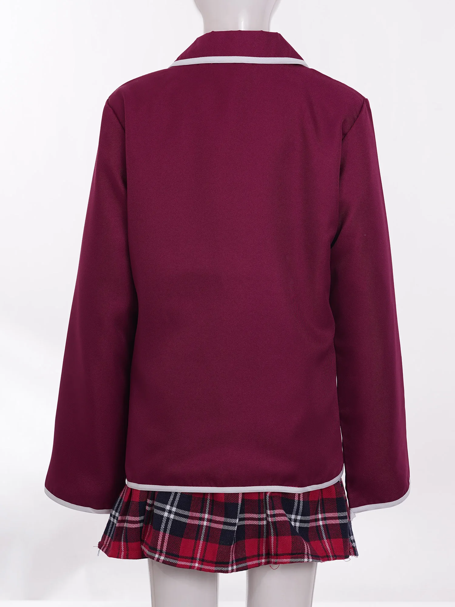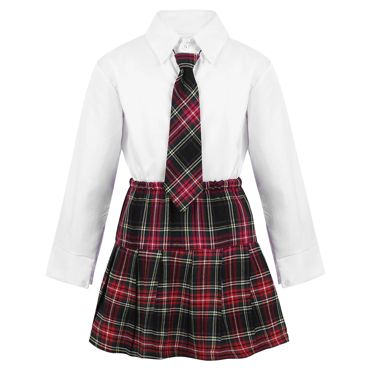 Chemise blanche à col rabattu, fermeture boutonnée sur le devant et sur les poignets.Jupe plissée à cravate, taille élastique avec motif à carreaux assorti.