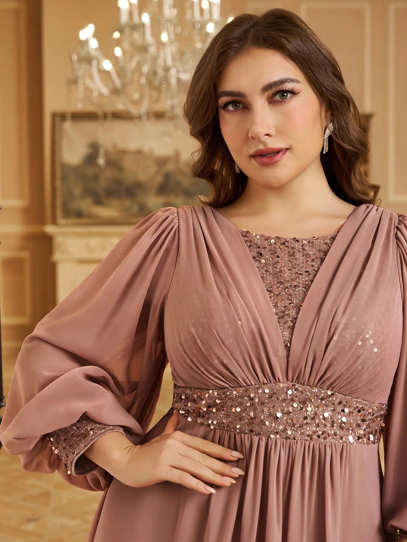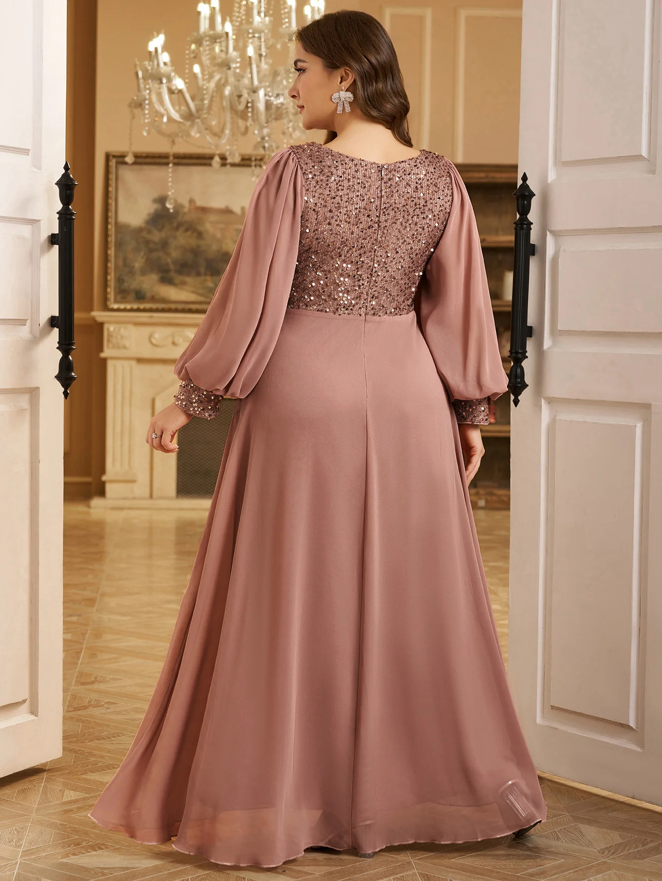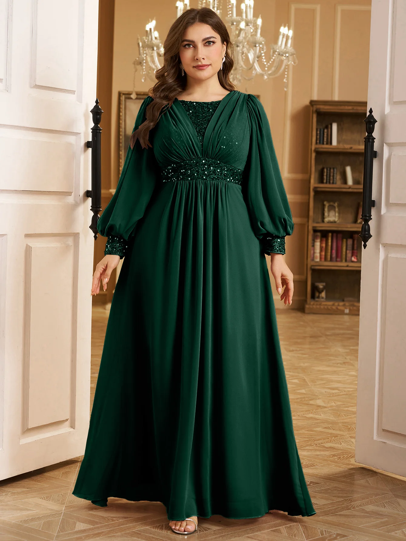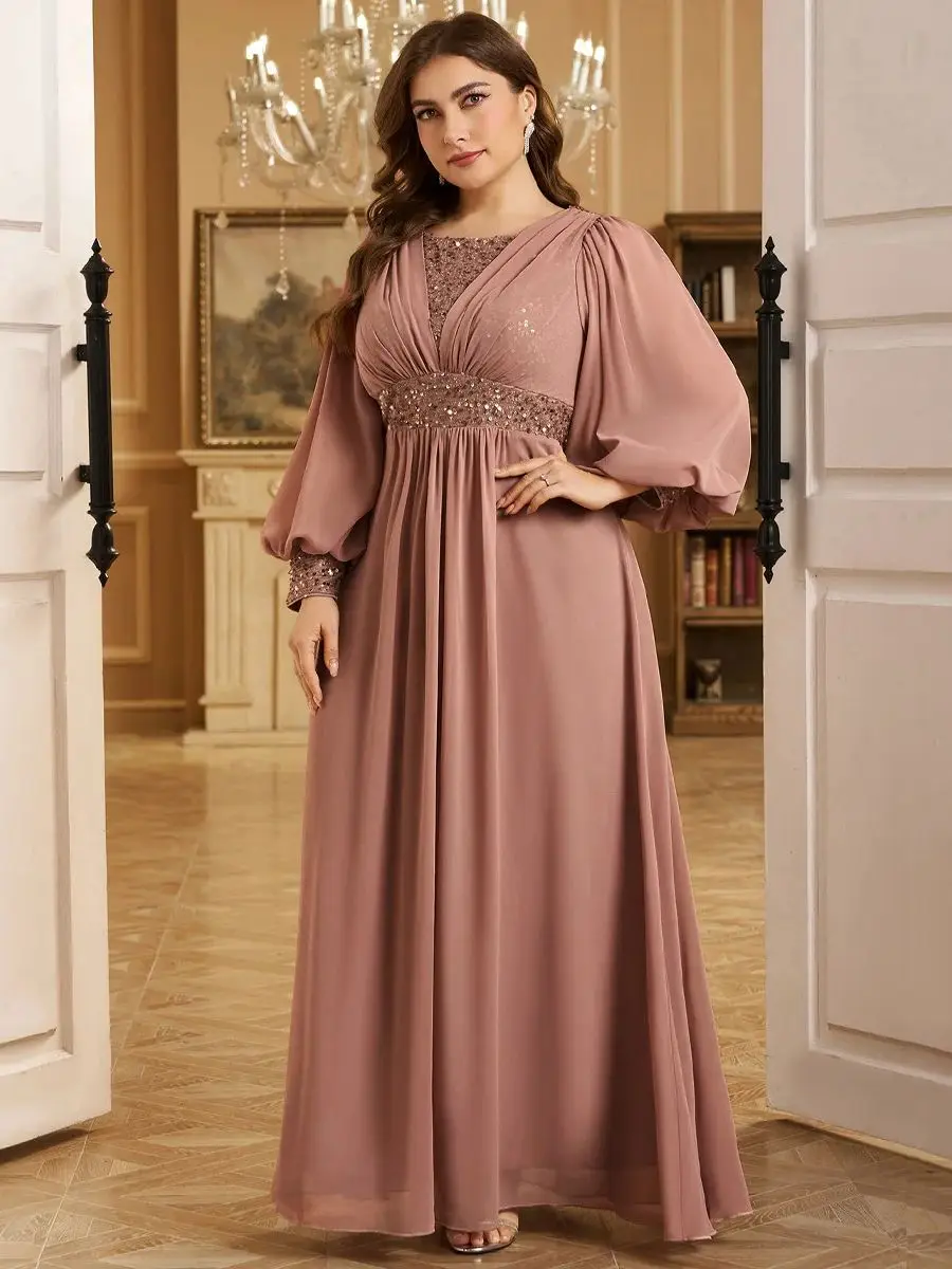 UNITHORSE Robe de soirée formelle en mousseline de soie, grande taille, col en V, manches lanternes, paillettes, patchwork