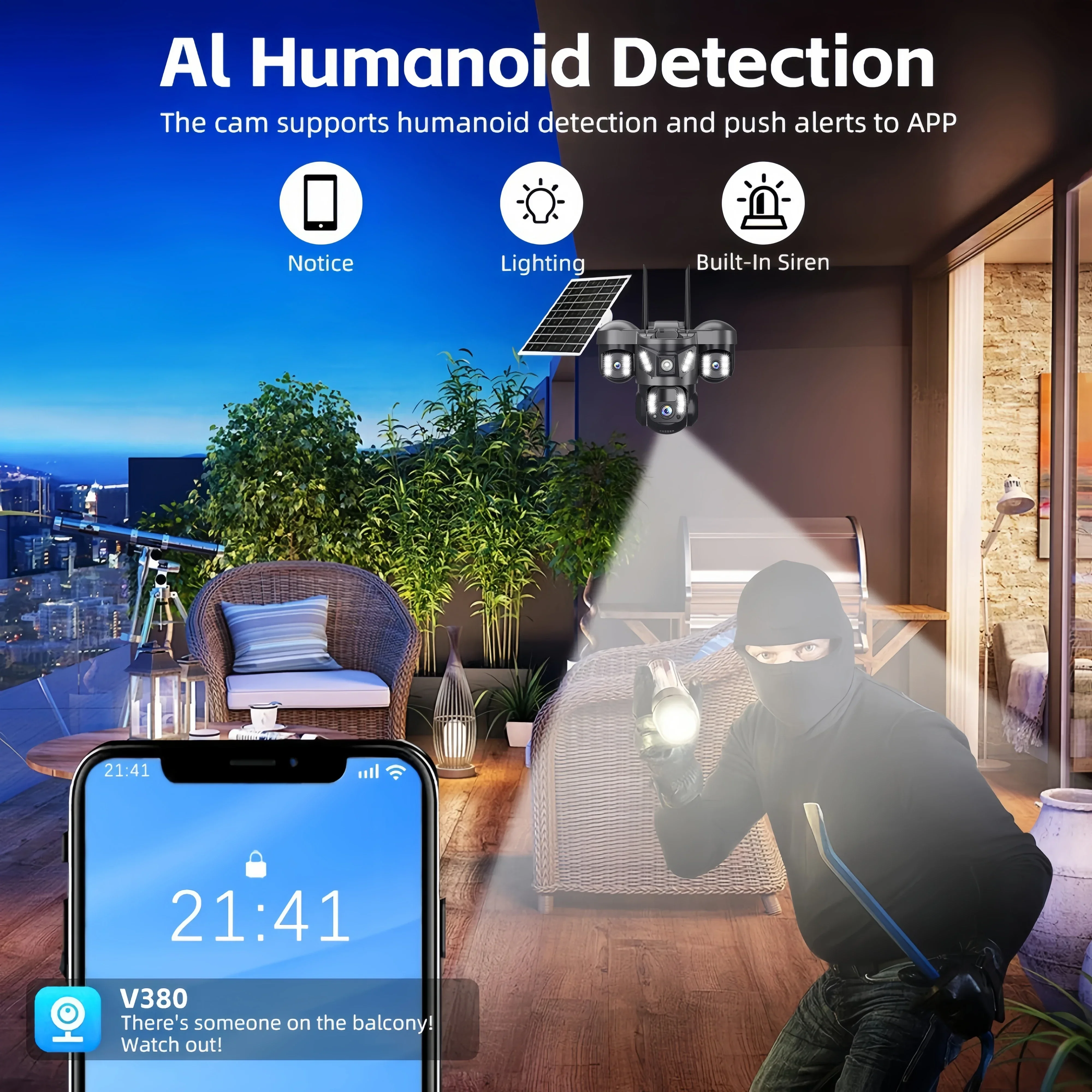 Trouve rapidement des cibles humaines et envoie immédiatement une notification à votre téléphone, vous permettant de voir ce qui se passe n'importe o.Il détecte uniquement la forme humaine et ne se déclenchera pas faussement pour des objets tels que des voitures et des arbres.