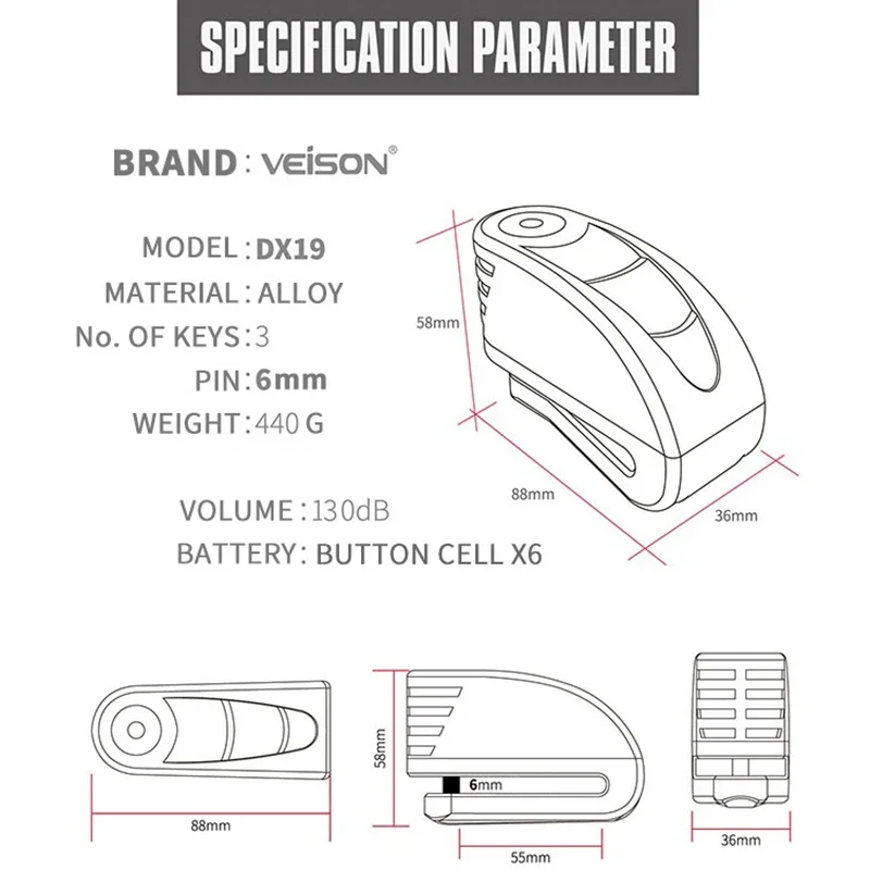 Verrou d'alarme étanche pour moto VEISON - Modèle DX19🔐