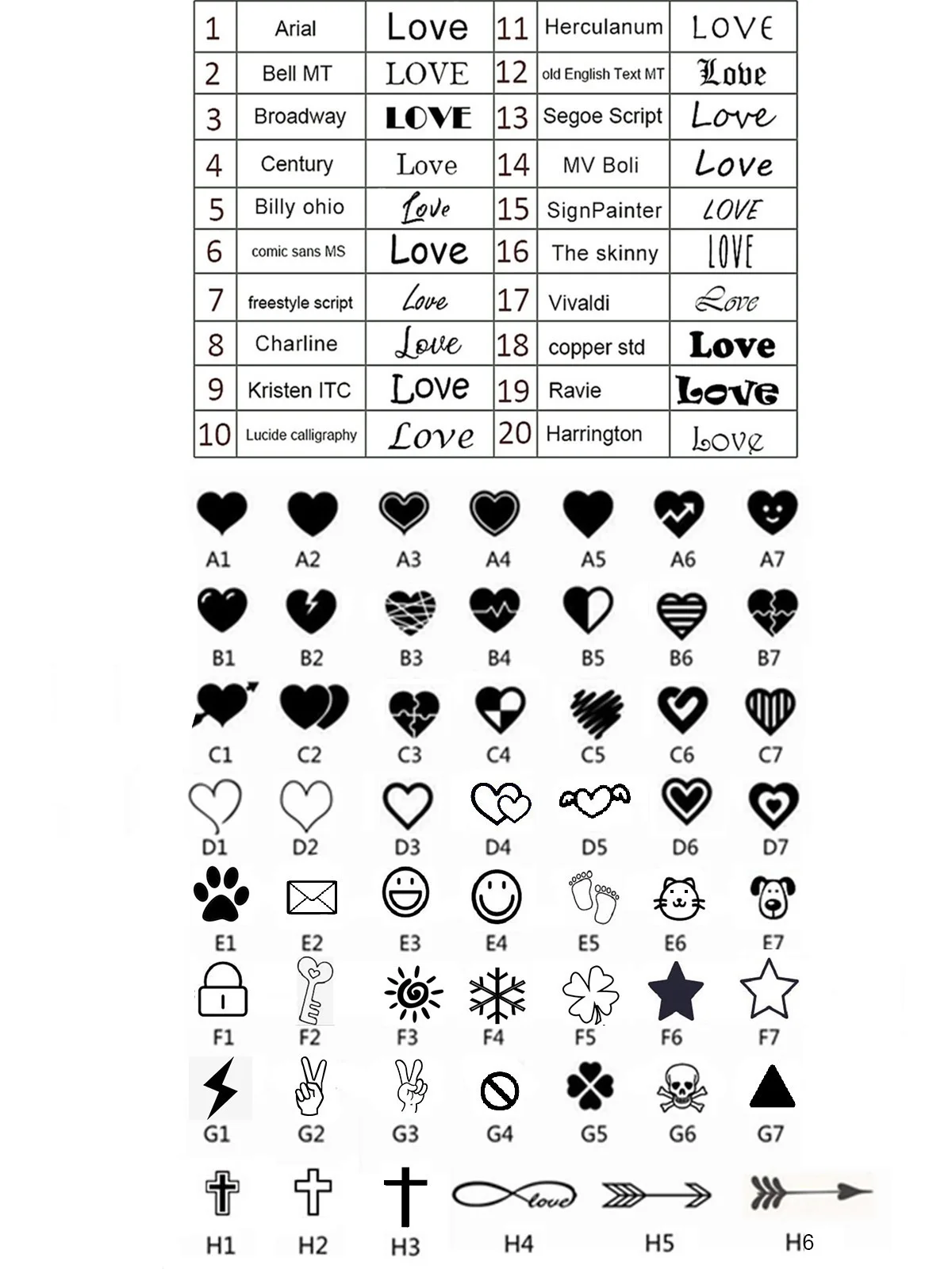 Choisissez la police ou les symboles souhaités et indiquez au service client les chiffres arabes correspondants ou laissez une note.