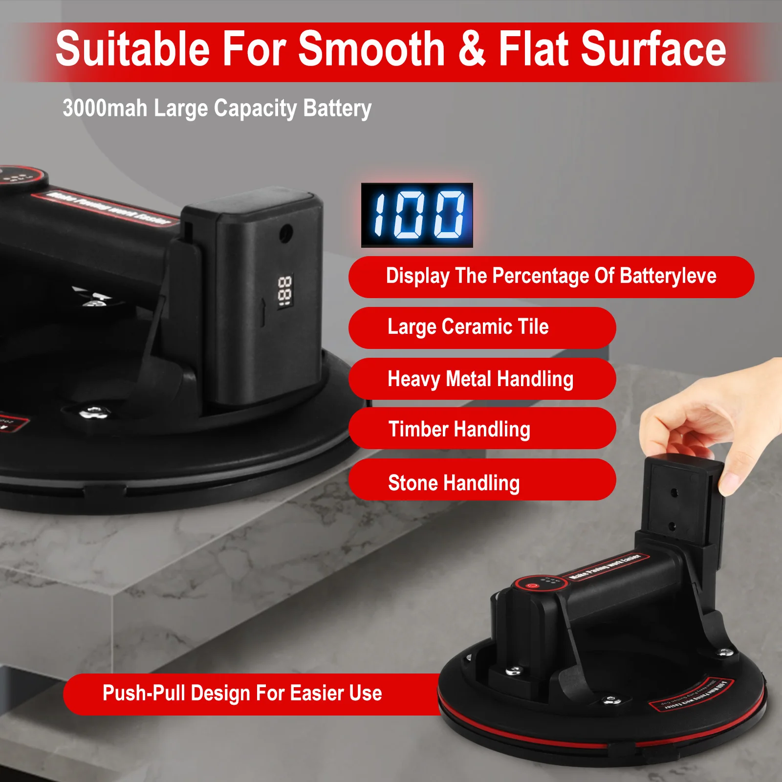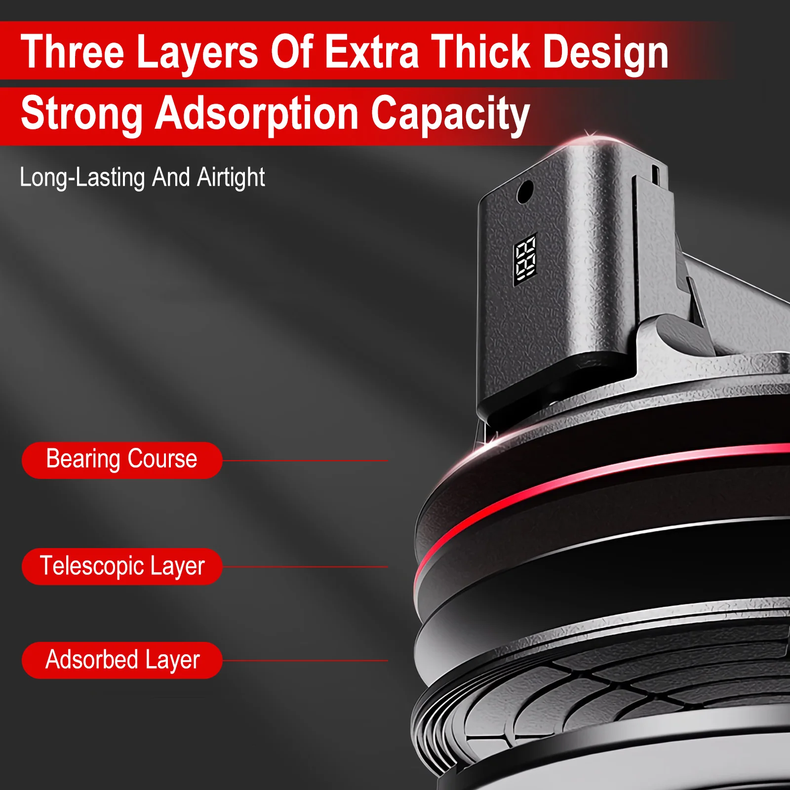 Triple tampon et triple joint La structure en caoutchouc à trois couches forme une cavité et un triple joint, offre de meilleures performances d'étanchéité et maintient la puissance d'aspiration pendant plus de 6 heures.La batterie amovible peut fonctionner pendant environ 8 heures après une charge complète et la capacité de charge sûre est de 200 kg.