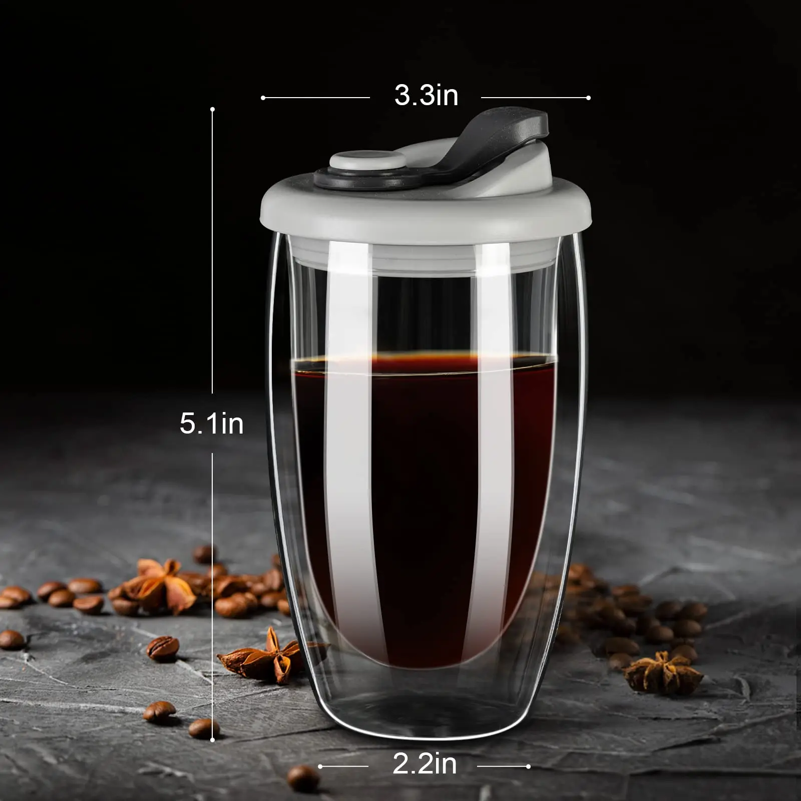 Large variété d'utilisations : notre tasse à café en verre a un aspect cristallin, des lignes douces et délicates, se sent bien et facile à tenir.Les tasses à café en verre transparent sont parfaites pour préparer du thé, du café, des lattés, des smoothies, des desserts et des jus de fruits.Que ce soit à la maison ou en camping, la tasse à café en verre à double paroi avec couvercle en silicone peut vous apporter beaucoup d'aide.