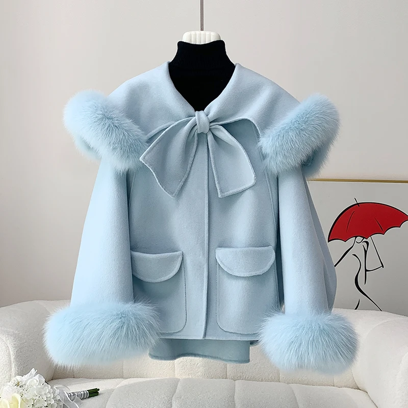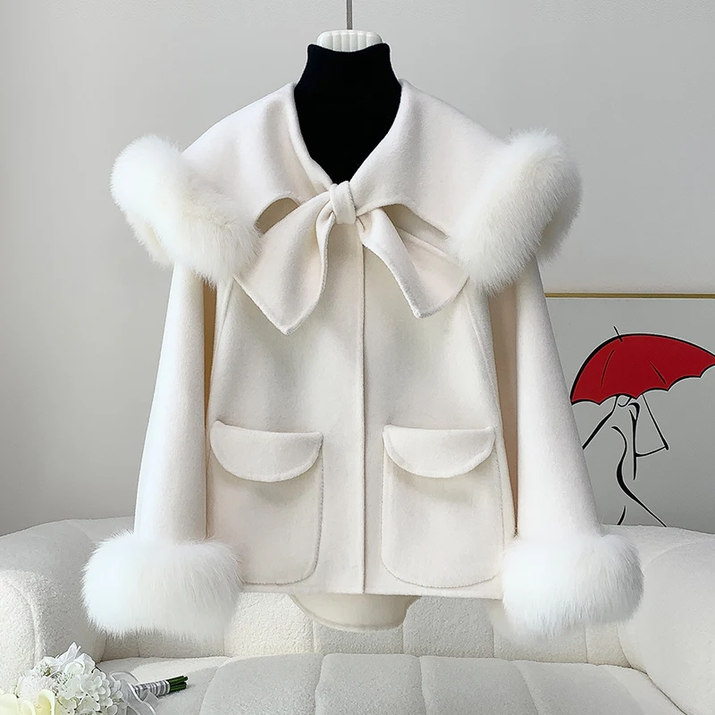 Veste courte en laine Double face pour femme, avec nœud, peluche épaisse, automne et hiver 2024