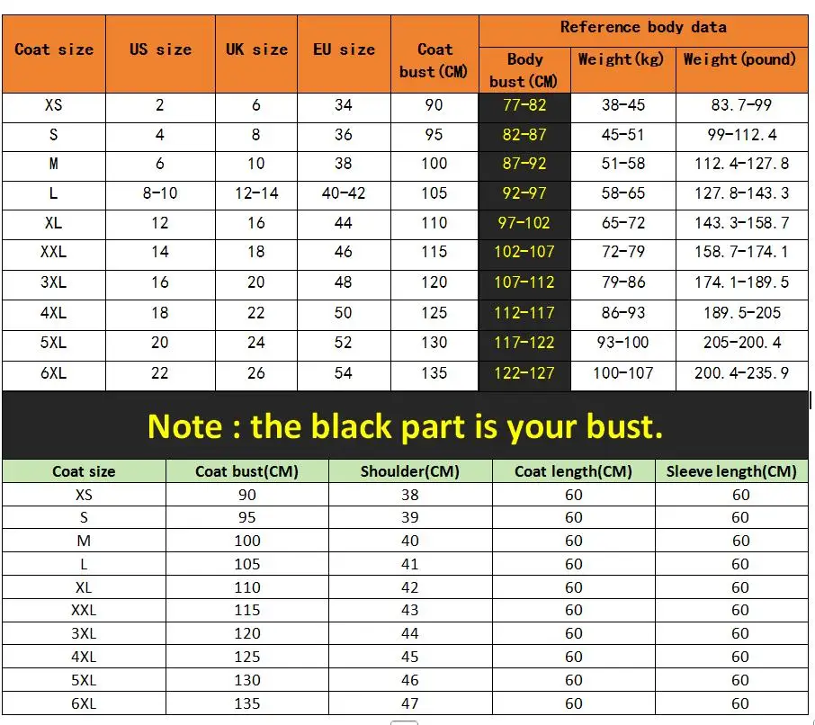 Veuillez faire attention au tableau des tailles, en particulier au buste.Le tableau montre les paramètres extérieurs du manteau.La taille individuelle doit être déterminée par la taille de votre buste plus 6-8 cm, par exemple si votre tour de poitrine est de 82 cm, 82 + 8 = 90 cm, prenez donc la taille XS.