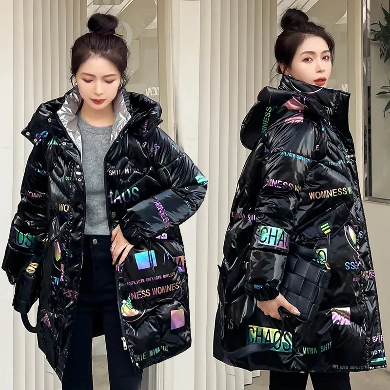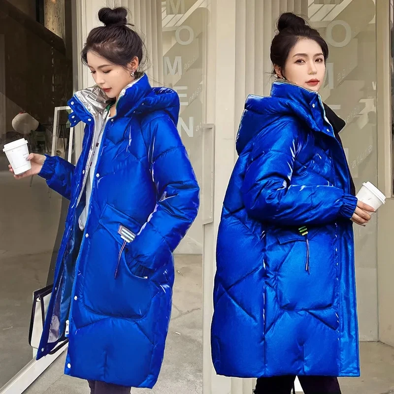 Vestes d'hiver épaisses et chaudes en tissu brillant tendance 2023, manteaux matelassés en coton pour femmes, parkas mi-longues pour femmes, vêtements d'extérieur féminins