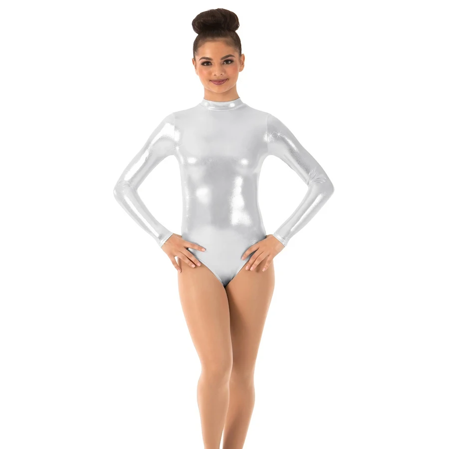 Filles femmes argent brillant métallique vêtements de danse col roulé Art gymnastique justaucorps Costumes Ballet danse justaucorps à manches longues