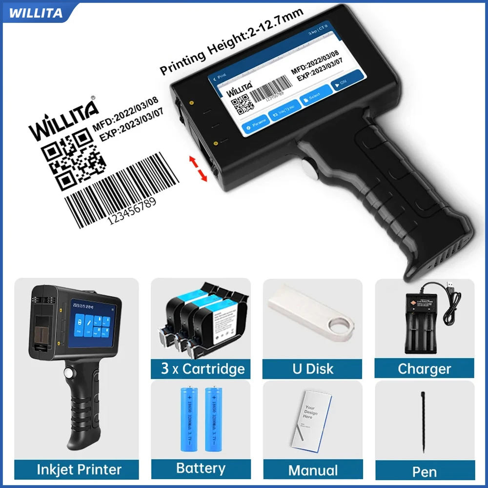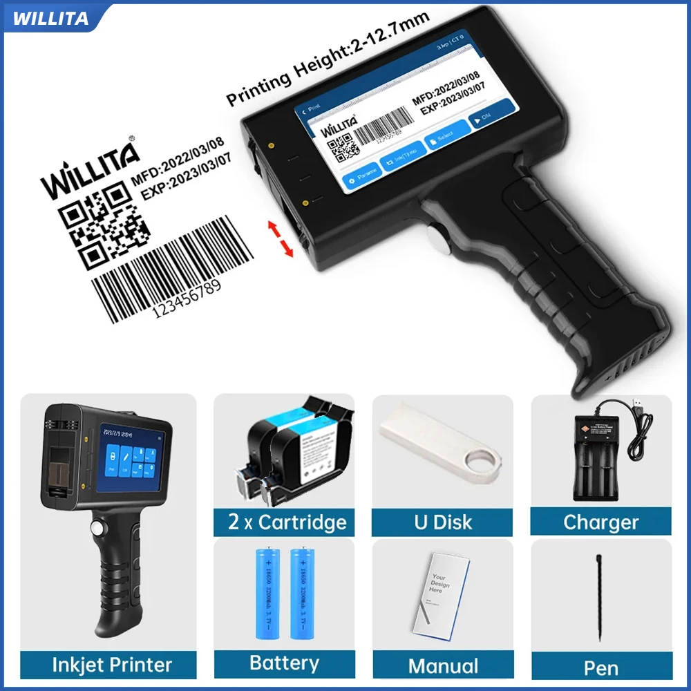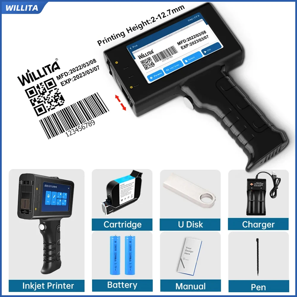 WILLITA L1 – imprimante à jet d'encre Portable 12.7mm, Machine de marquage, barre QR, Code de lot, Date, numéro, Logo, Date d'expiration, étiquette, Stock ue