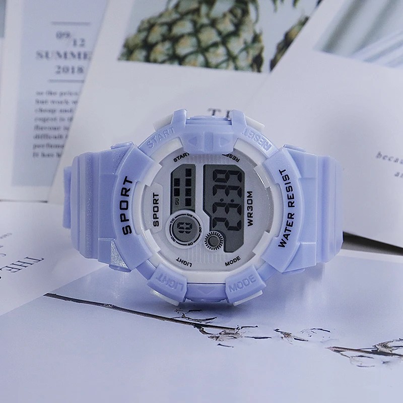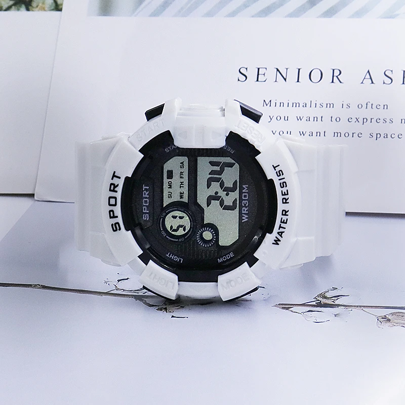 --Conception de montre numérique : design de cadran de sport à la mode pour les enfants, perspectives de style sportif.Grand cadran et chiffres avec la lumière, affichent l'heure claire dans l'obscurité.Utilisez la lampe EL, appuyez sur le bouton « LIGHT » pour voir l'heure clairement dans la lumière.