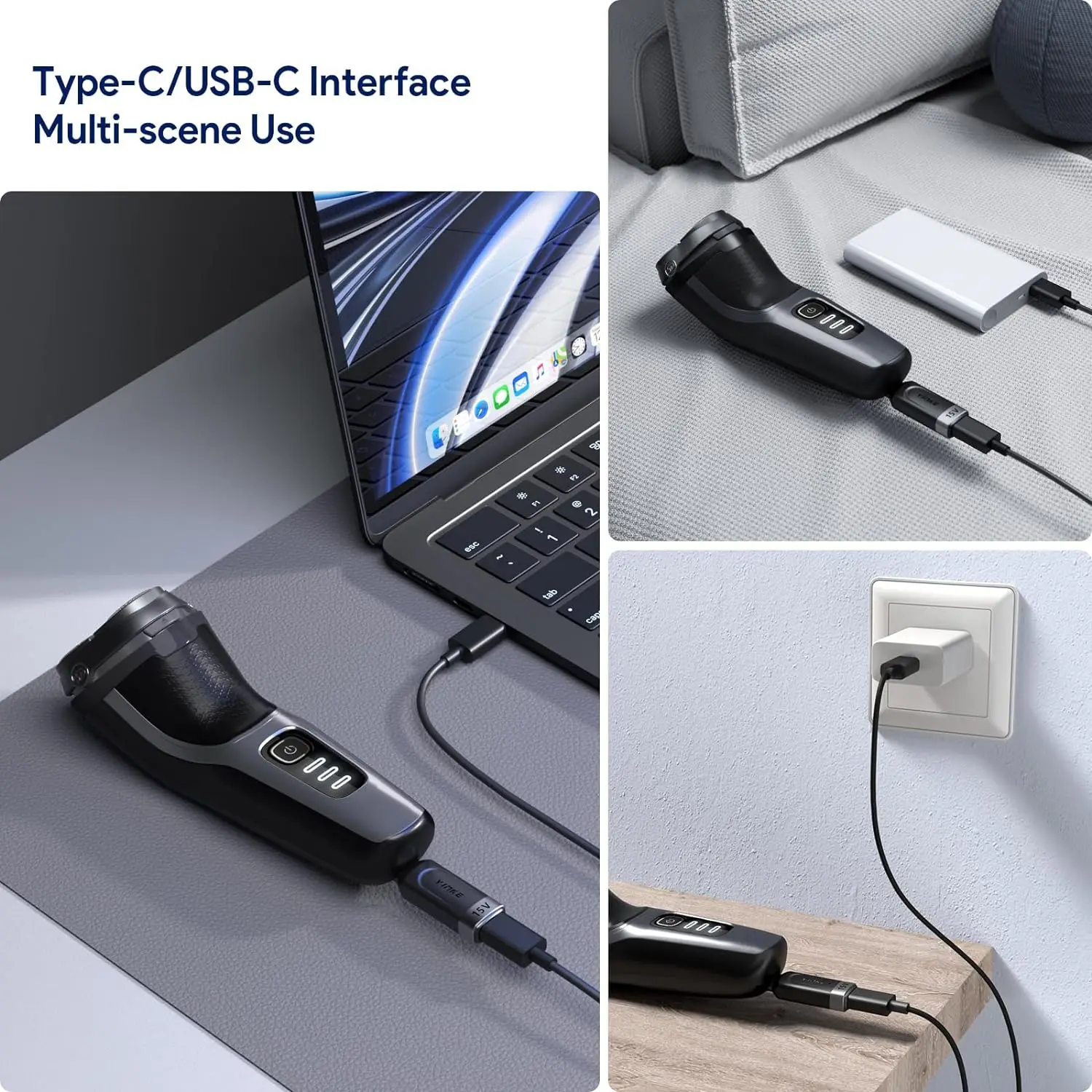 ✨Transformant le paradis de charge traditionnel : grâce à l'utilisation d'un convertisseur de charge d'adaptateur de rasoir de type C et d'un câble de charge de type C, le rasoir électrique peut être chargé à tout moment et en tout lieu à l'aide d'une banque d'alimentation, d'un chargeur de voiture ou de tout autre appareil de charge compatible.Cette fonctionnalité pratique garantit un rasage sans souci pendant vos voyages.