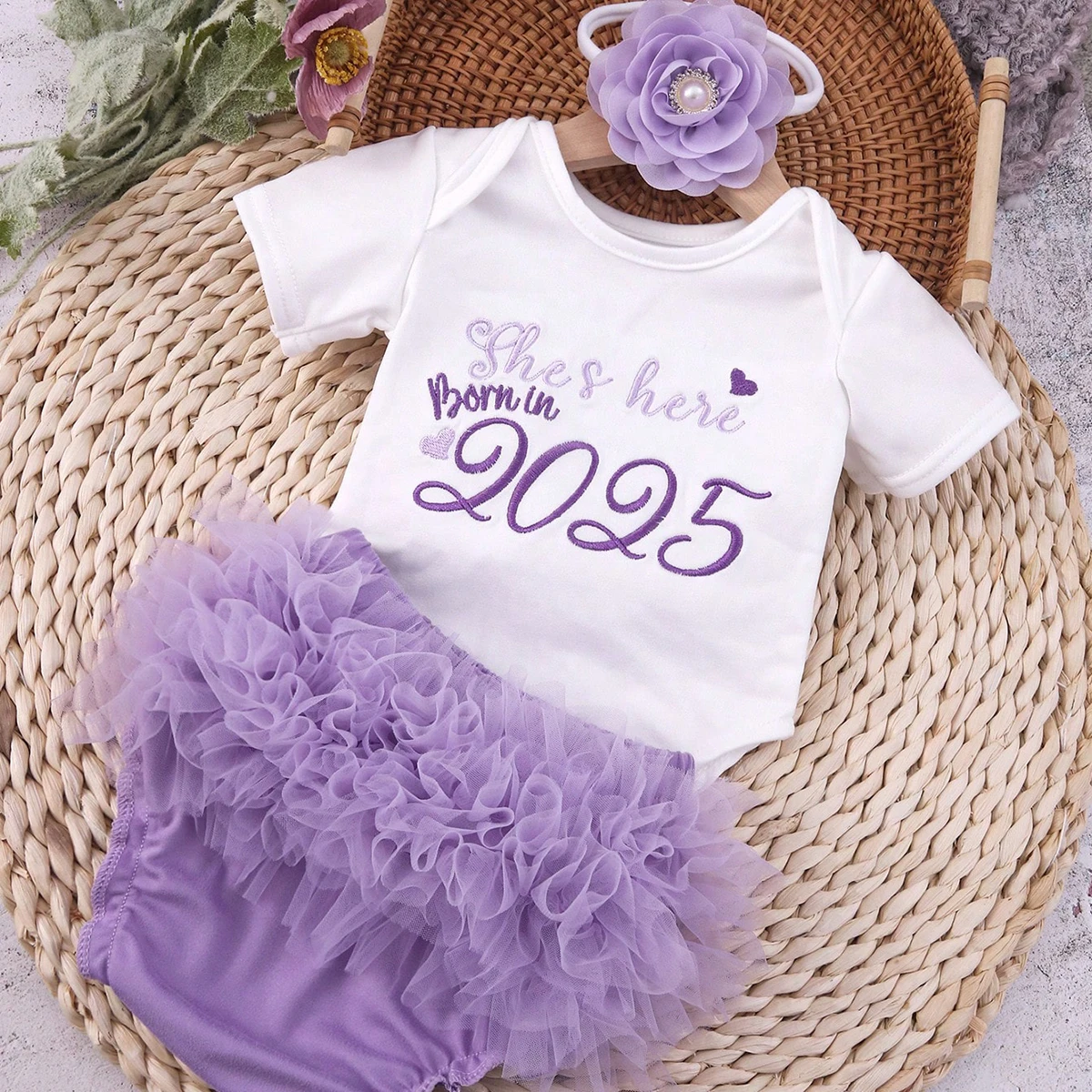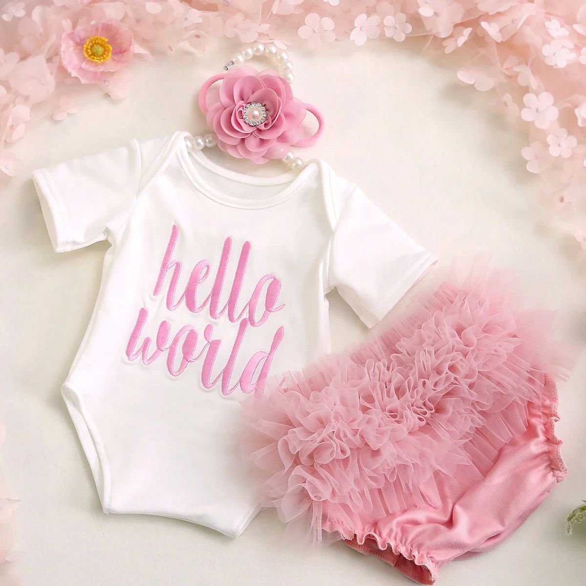 Ylsteed – ensemble de photographie pour nouveau-né, combinaison à manches imprimées avec lettres Hello World, avec slip et couvre-chef multicouches à volants