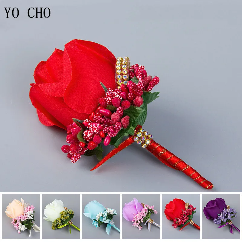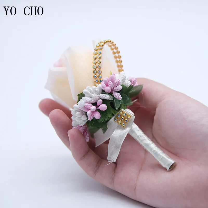 YO CHO Bouquet de mariage fleurs de roses artificielles broche bleue Corsages paillettes strass ruban dentelle classique bal boutonnière épingles