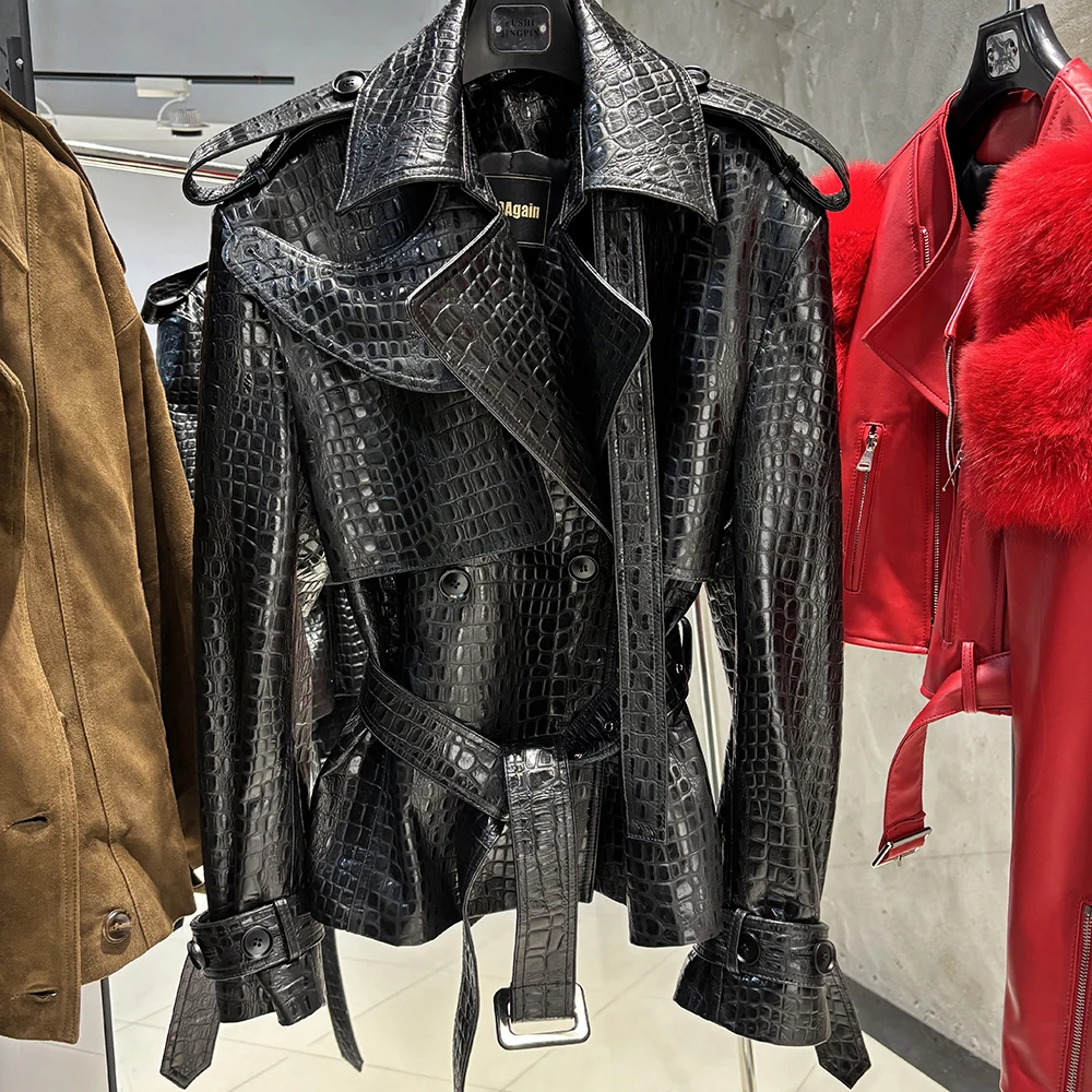 YOLOAgain Veste en cuir à motif croco pour femme, double boutonnage, cuir véritable, dames, automne, nouveau, 2023