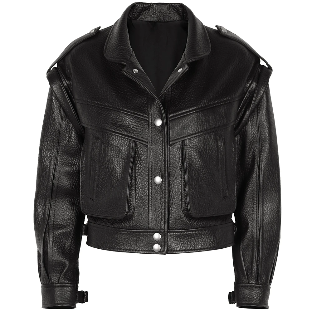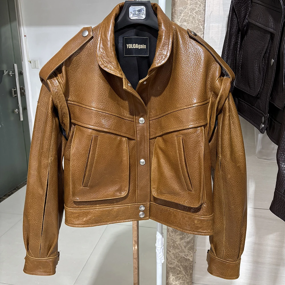 YOLOAgain Veste en cuir véritable marron foncé pour femme, veste de motard en peau de mouton, haute qualité, femme, automne 2024